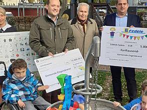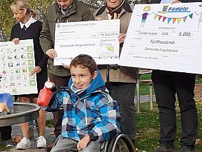 Manuel Linkenheil (Erster von links), Vorstandsvorsitzender der Lebenshilfe-Stiftung, freut sich, einen Spendenscheck von über 10 000 Euro an Engelsbrands Bürgermeister Thomas Keller (Dritter von links) überreichen zu können.